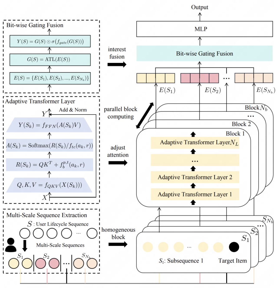 网易云音乐生成式推荐大模型“Climber”的核心思路是基于推荐场景的特点,重构Transformer的关键模块。具体来说,它包含三大核心创新组件:多尺度序列提取(MSE)、自适应 Transformer层(ATL)、逐位门控融合(BGF)。这三个组件环环相扣,分别解决“长序列计算效率”、“多场景适配”、“多兴趣融合”的问题。