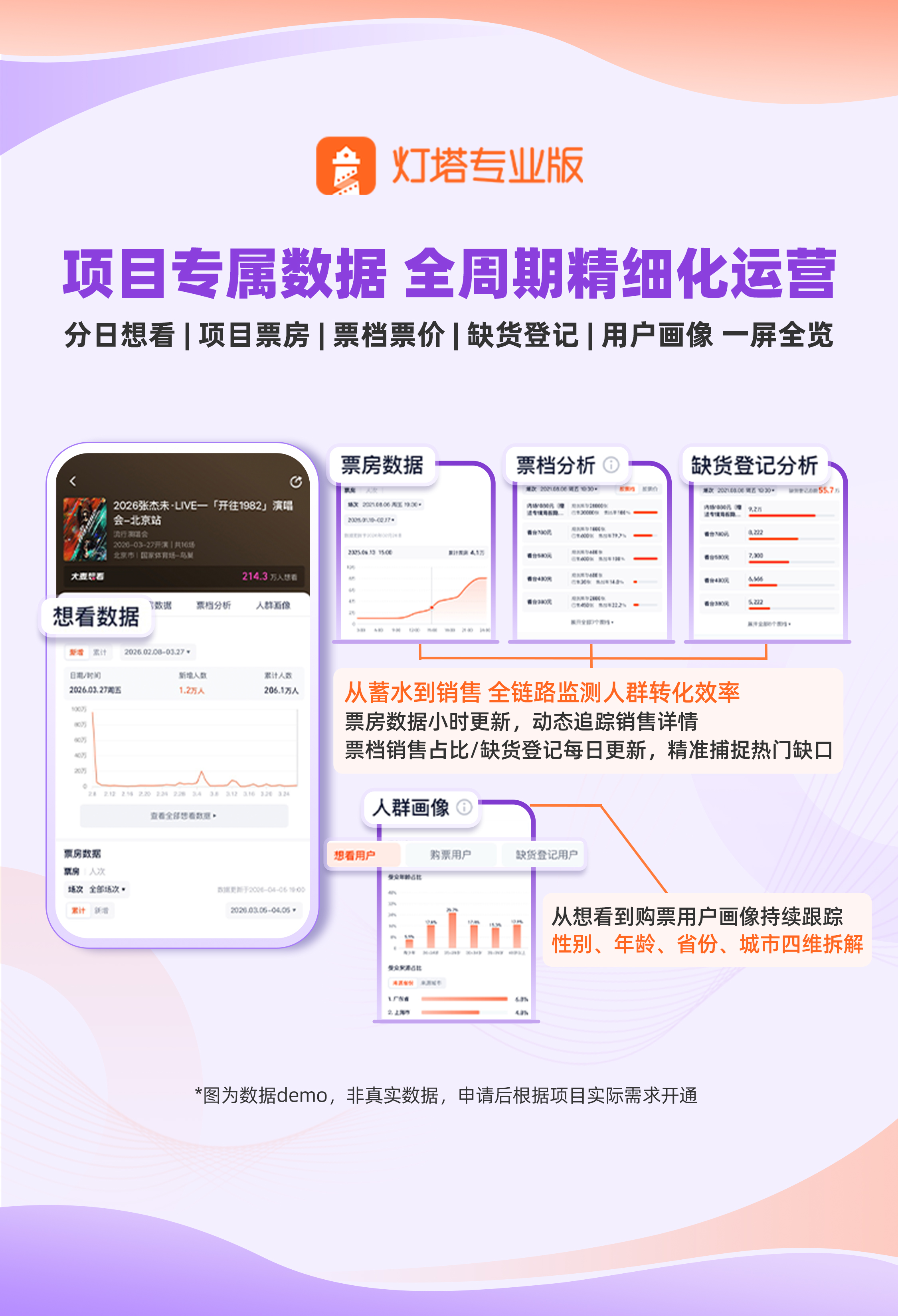 升级版产品深度整合了“大麦想看数据”“票房数据”“票档票价分析”“缺货登记分析”“人群画像”及“艺人城市许愿”六大独家模块,能够覆盖项目热度预判、销售动态监控、定价策略优化、增量空间挖掘、精准营销投放及巡演路线规划等环节,实现全维度穿透式市场洞察。